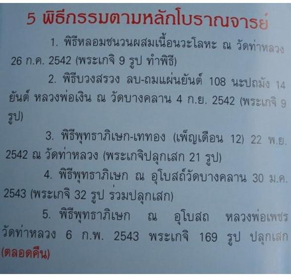 เหรียญบาตรน้ำมนต์หลวงพ่อเงิน บางคลาน หลังหลวงพ่อเพชร รุ่นพระพิจิตร เนื้อนวะ (ตอก 2 โค๊ตชัดๆ) พิมพ์เล็ก ขนาดเส้นผ่าศูนย์กลาง 3.0 ซม. สร้างปี 2542-43 จำนวนสร้างน้อย..หายากสุดๆ สภาพเหรียญเดิมๆ..ผิวไฟยังปรากฏให้เห็น...สวยเยี่ยมจริงๆ.. -พระรูปหล่อหลวงพ่อเงิน และเหรียญรุ่นนี้เป็นที่นิยมมากในขณะนี้..หายากและราคาขยับสูงขึ้นเรื่อยๆ 1. รูปหล่อโบราณ พิมพ์นิยม ถอดพิมพ์จากองค์แชมป์ในอดีต ใช้กรรมวิธีหล่อโบราณ (เทดินไทย) จัดสร้างเป็นเนื้อนวโลหะ กลับดำผสมทองคำหนัก 109 บาท เท่าอายุหลวงพ่อเงิน (มีโค้ด 4 อย่าง และหมายเลข กำกับรวมเป็น 4 โค้ด) ผิวแต่งให้สวยงาม จัดสร้าง 1,999 องค์ ส่วนผิวไฟไม่ได้แต่งสร้าง 599 องค์ 2.เหรียญบาตรน้ำมนต์หลวงพ่อเงิน บางคลาน หลังหลวงพ่อเพชร รุ่นพระพิจิตร เนื้อนวะรุ่นนี้ สร้างได้สวยงามมาก อีกทั้ง 5 พิธีกรรมอันยิ่งใหญ่ พร้อมมวลสารจากเกจิดังทั่วประเทศ 95 รายการ ส่วนผสมของเนื้อนวโลหะ มีรายละเอียดดังต่อไปนี้ ชนวน-มวลสาร-โลหะธาตุ-แผ่นยันต์ ที่ผสมในวัตถุมงคลเนื้อนวโลหะรุ่นพระพิจิตร มีทั้งหมด 95 รายการ หนักรวม 32 กิโลกรัม +ทองคำหนัก 109 บาท แค่มวลสารก็เข้มขลังสุดยอดแล้วครับ ปลุกเสกอีก 5 พิธีกรรมยิ่งสุดยอด ชนวน-มวลสาร-โลหะธาตุ-แผ่นยันต์ที่สำคัญมีดังนี้ 1. ชนวนพระเครื่องเก่าเมืองพิจิตร เหรียญจอบเล็ก หลวงพ่อเงินบางคลาน 1 องค์ หลวงพ่อเพชร มือแป 2 องค์ รูปหล่อหลวงพ่อเขียน(หน้าลิง) 4 องค์ รูปหล่อหลวงพ่อโพธิ์ วัดวังหมาเน่า รุ่น 1 และ 2 จำนวน 2 องค์ หลวงพ่อเพชร หลังอุ รุ่น 2 (หลวงพ่อทวีสร้าง) 1 องค์ เหรียญหลวงพ่อยิ้ม วัดท่าหลวง 3 เหรียญ พระพิจิตร เม็ดข้าวเม้า(เกศคด)ชำรุด 1 องค์ รูปหล่อหลวงพ่อเขียนสำนักขุนเณรเนื้อเงิน ปี 2502 1 องค์ 2. ชนวนเหรียญหางแมงป่อง เหรียญใบมะยม เหรียญ ร5 หลวงปู่ภู วัดท่าฬ่อ 8 เหรียญ 3. ชนวนตะกรุดคู่ชีวิต หลวงพ่อพิธ วัดฆะมัง 1 ดอก ตะกรุดหลวงพ่อเตียง วัดเขารูปช้าง 2 ดอก 4. ชนวนตะกรุดหลวงพ่อเดิม วัดหนองโพ 2 ดอก จ.นครสวรรค์ ตะกรุดหลวงพ่อฮวบ วัดหาดงิ้ว จ.อุตรดิตถ์ 1 ดอก ตะกรุดหลวงพ่อไซ้ร วัดช่องลม จ.อุตรดิตถ์ 1 ดอก 5. ชนวนรูปหล่อหัวไม้ขีด 5 องค์ ตะกรุดหลวงพ่อทบ วัดชนแดน จ.เพชรบูรณ์ 7 ดอก 6. ชนวนรูปปั้นลอยองค์ จอบใหญ่ จอบเล็ก เนื้อทองคำ หลวงพ่อเงิน บางคลาน(พิธีเพิร์ธ) 1ชุด 3 องค์ หนัก 65 กรัม 7. ชนวนเหรียญจอบเล็ก จอบใหญ่ ขวัญถุงหลวงพ่อเงิน เหรียญหลวงพ่อเงิน-กรมหลวงชุมพร ปี 15 จำนวน 7 เหรียญ 8. ชนวนพระกริ่งนเรศวรพระองค์ดำ 100 ปี พิษณุโลกพิทยาคม 2542 หนัก 5 กิโลกรัม 9. ชนวนพระพุทธชินราชอินโดจีนมหาจักรพรรดิ 115 ปี พิษณุโลกพิทยาคม 10. ชนวนพระชัยวัฒน์พระองค์ดำสุดฤกษ์ 100 ปี พิษณุโลกพิทยา