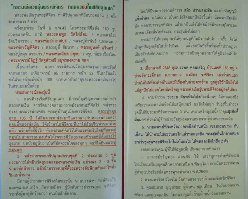 เหรียญบาตรน้ำมนต์หลวงพ่อเงิน บางคลาน หลังหลวงพ่อเพชร รุ่นพระพิจิตร เนื้อทองแดงแก่ชนวน พิมพ์เล็ก ขนาดเส้นผ่าศูนย์กลาง 3.0 ซม. สร้างปี 2542-43 จำนวนสร้างน้อย ทั้งพระรูปหล่อลอยองค์ และเหรียญเป็นที่นิยมมากในรุ่นนี้ ขณะนี้หายากและราคาไปสูงมากครับ มีโอกาสควรรีบบูชาเก็บไว้ 1. รูปหล่อโบราณ พิมพ์นิยม ถอดพิมพ์จากองค์แชมป์ในอดีต ใช้กรรมวิธีหล่อโบราณ (เทดินไทย) จัดสร้างเป็นเนื้อนวโลหะ กลับดำผสมทองคำหนัก 109 บาท เท่าอายุหลวงพ่อเงิน (มีโค้ด 4 อย่าง และหมายเลข กำกับรวมเป็น 4 โค้ด) ผิวแต่งให้สวยงาม จัดสร้าง 1,999 องค์ ส่วนผิวไฟไม่ได้แต่งสร้าง 599 องค์ 2.เหรียญบาตรน้ำมนต์หลวงพ่อเงิน บางคลาน หลังหลวงพ่อเพชร รุ่นพระพิจิตร เนื้อทองแดง รุ่นนี้สร้างได้สวยงามมากๆ และ 5 พิธีใหญ่มาก มวลสารจากเกจิดังทั่วประเทศ 95 รายการ ส่วนผสมของเนื้อนวโลหะ มีรายละเอียดดังต่อไปนี้ ชนวน-มวลสาร-โลหะธาตุ-แผ่นยันต์ ที่ผสมในวัตถุมงคลเนื้อนวโลหะรุ่นพระพิจิตร มีทั้งหมด 95 รายการ หนักรวม 32 กิโลกรัม +ทองคำหนัก 109 บาท แค่มวลสารก็สุดยอดแล้วครับ ยังไม่ได้ปลุกเสกก็เข้มขลังสุดๆอยู่แล้ว นี่ปลุกเสกตั้ง 5 พิธีกรรมยิ่งสุดยอดไปกันใหญ่ ชนวน-มวลสาร-โลหะธาตุ-แผ่นยันต์ที่สำคัญขอหยิบยกมาเป็นตัวอย่างมีดังนี้ 1. ชนวนพระเครื่องเก่าเมืองพิจิตร เหรียญจอบเล็ก หลวงพ่อเงินบางคลาน 1 องค์ หลวงพ่อเพชร มือแป 2 องค์ รูปหล่อหลวงพ่อเขียน(หน้าลิง) 4 องค์ รูปหล่อหลวงพ่อโพธิ์ วัดวังหมาเน่า รุ่น 1 และ 2 จำนวน 2 องค์ หลวงพ่อเพชร หลังอุ รุ่น 2 (หลวงพ่อทวีสร้าง) 1 องค์ เหรียญหลวงพ่อยิ้ม วัดท่าหลวง 3 เหรียญ พระพิจิตร เม็ดข้าวเม้า(เกศคด)ชำรุด 1 องค์ รูปหล่อหลวงพ่อเขียนสำนักขุนเณรเนื้อเงิน ปี 2502 1 องค์ 2. ชนวนเหรียญหางแมงป่อง เหรียญใบมะยม เหรียญ ร5 หลวงปู่ภู วัดท่าฬ่อ 8 เหรียญ 3. ชนวนตะกรุดคู่ชีวิต หลวงพ่อพิธ วัดฆะมัง 1 ดอก ตะกรุดหลวงพ่อเตียง วัดเขารูปช้าง 2 ดอก 4. ชนวนตะกรุดหลวงพ่อเดิม วัดหนองโพ 2 ดอก จ.นครสวรรค์ ตะกรุดหลวงพ่อฮวบ วัดหาดงิ้ว จ.อุตรดิตถ์ 1 ดอก ตะกรุดหลวงพ่อไซ้ร วัดช่องลม จ.อุตรดิตถ์ 1 ดอก 5. ชนวนรูปหล่อหัวไม้ขีด 5 องค์ ตะกรุดหลวงพ่อทบ วัดชนแดน จ.เพชรบูรณ์ 7 ดอก 6. ชนวนรูปปั้นลอยองค์ จอบใหญ่ จอบเล็ก เนื้อทองคำ หลวงพ่อเงิน บางคลาน(พิธีเพิร์ธ) 1ชุด 3 องค์ หนัก 65 กรัม 7. ชนวนเหรียญจอบเล็ก จอบใหญ่ ขวัญถุงหลวงพ่อเงิน เหรียญหลวงพ่อเงิน-กรมหลวงชุมพร ปี 15 จำนวน 7 เหรียญ 8. ชนวนพระกริ่งนเรศวรพระองค์ดำ 100 ปี พิษณุโลกพิทยาคม 2542 หนัก 5 กิโลกรัม 9. ชนวนพระพุทธชินราชอินโดจีนมหาจักรพรรดิ 115 ปี พิษณุโลกพิทยาคม 10. ชนวนพระชัยวัฒน์พระองค์ดำสุดฤกษ์ 100 ปี พิษณุโล